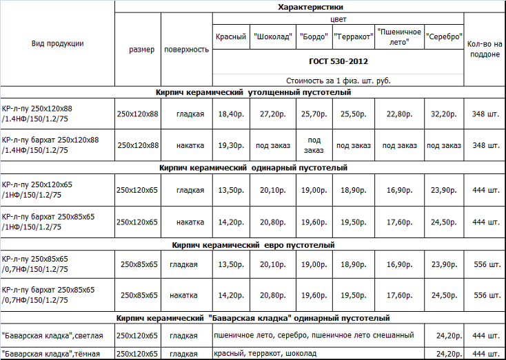 | 11 | Кирпич керамический утолщенный щелевой 250*120*88 Гост 530-2012, М-125 Богородск |